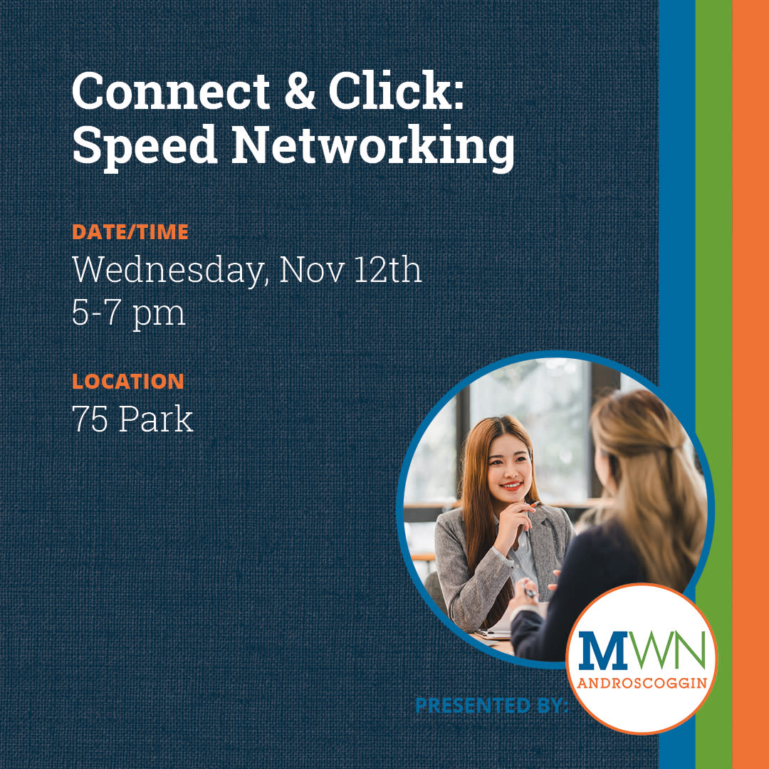 Join the Maine Women’s Network for a fun, fast-paced evening of speed networking on Tuesday, November 12th from 5:00–7:00 PM at 75 Park in Lewiston!